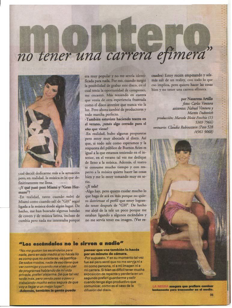 _ ¿Y qué pasó post Miami y "Gran hermano"?_ En realidad, tanto cuando volví de Miami como cuando salí de "GH" seguí ligada a la música desde algún lugar. De hecho, me han buscado algunas bandas de covers y de música latina, incluso de cumbia, pero nada me interesaba porque era muy popular y no me sentía identificada para nada. Por eso cuando surgió la posibilidad de grabar este disco , en el cual tenía la oportunidad de componer, me encantó. Más teniendo en cuenta que venía de otra experiencia frustrada como el disco anterior que nunca vio la luz. Pero ahora cambié de productores y todo marcha perfecto.